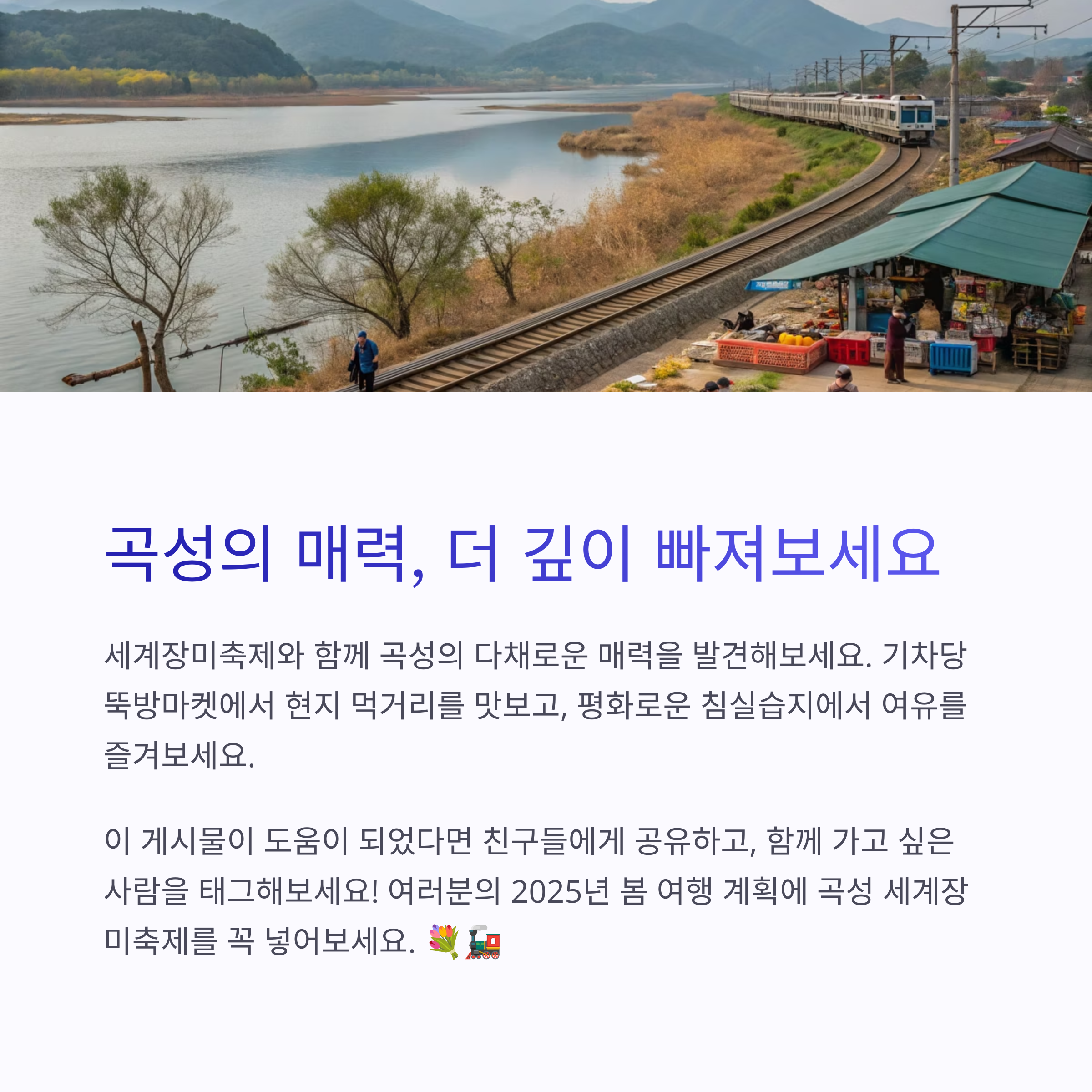 곡성의 봄을 더욱 알차게 즐기기 위해선 인근 명소도 함께 둘러보는 것이 좋습니다. 침실습지는 생태 탐방로가 잘 조성되어 있어 산책하기에 안성맞춤이며, 주말마다 열리는 기차당 뚝방 마켓에서는 다양한 수공예품과 간식들을 만나볼 수 있습니다. 또한 유채꽃이 흐드러진 뚝방길은 SNS에서도 ‘인생샷 명소’로 입소문을 타며 사진 애호가들에게 사랑받고 있습니다. 곡성은 단지 한 번의 방문으로 끝날 수 없는, 사계절 내내 매력이 넘치는 여행지입니다.