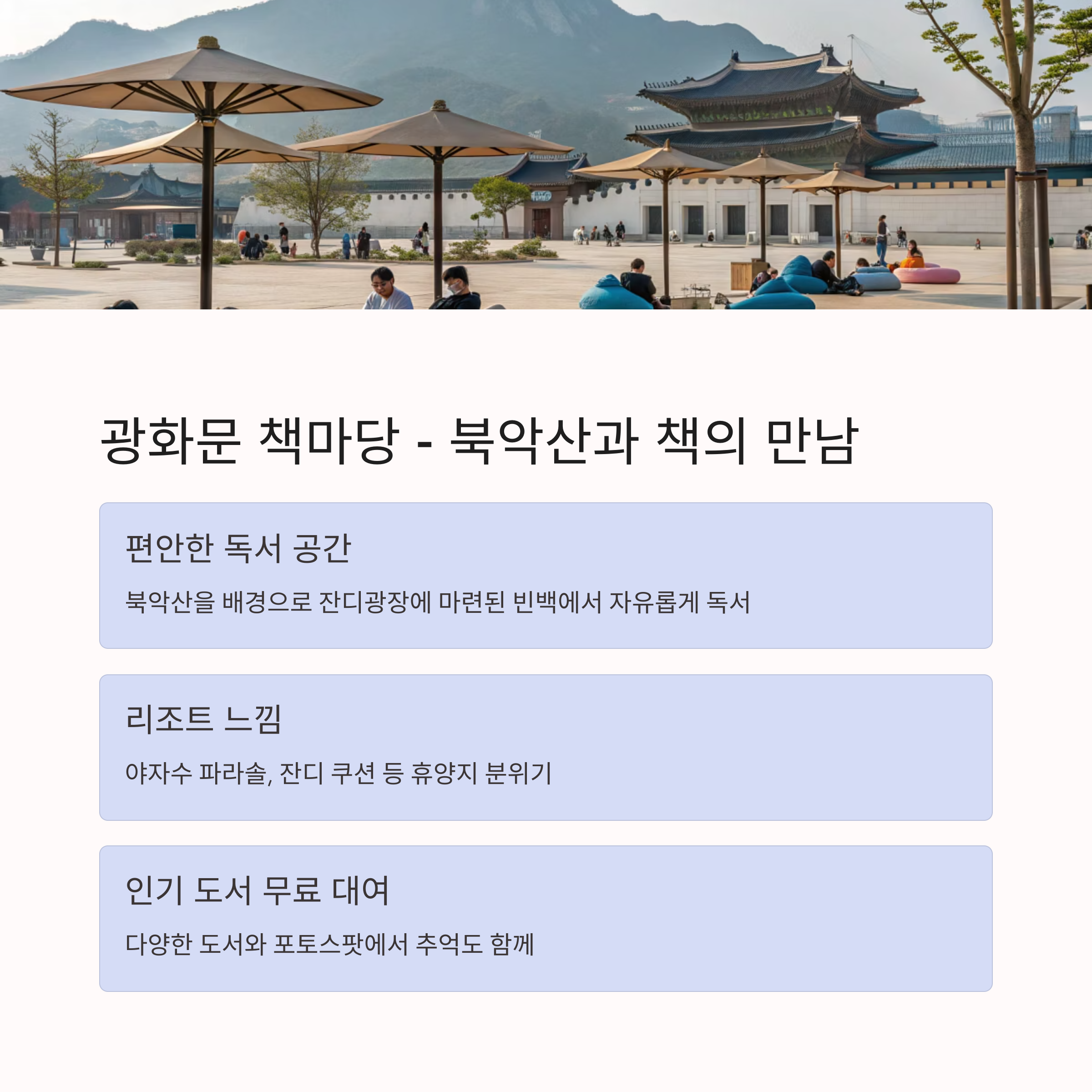 "광화문 책마당은 책과 풍경이 어우러진 최고의 힐링 명소입니다."