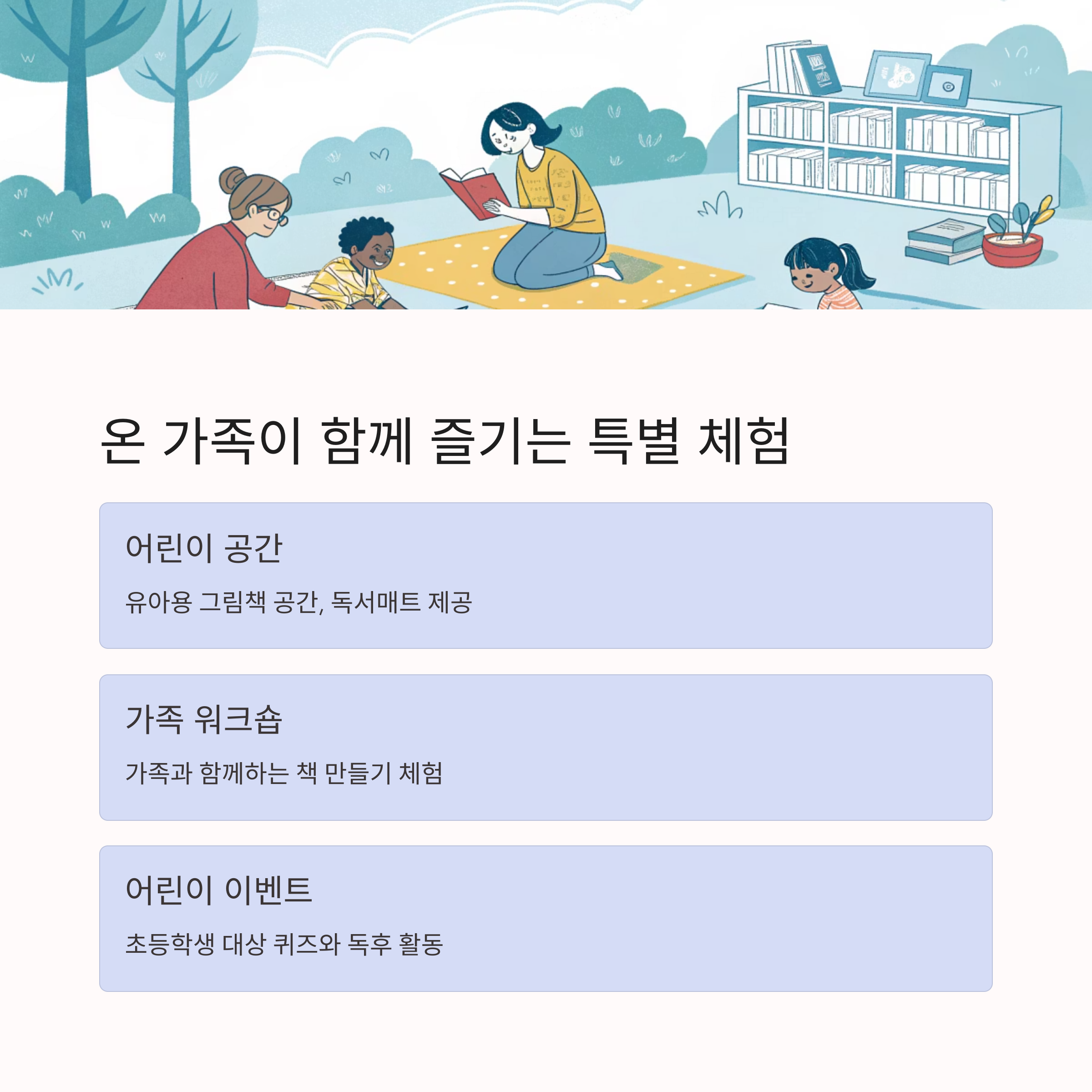 어린이부터 중장년까지 전 세대가 함께 책을 매개로 즐거운 하루를 보낼 수 있는 곳입니다.