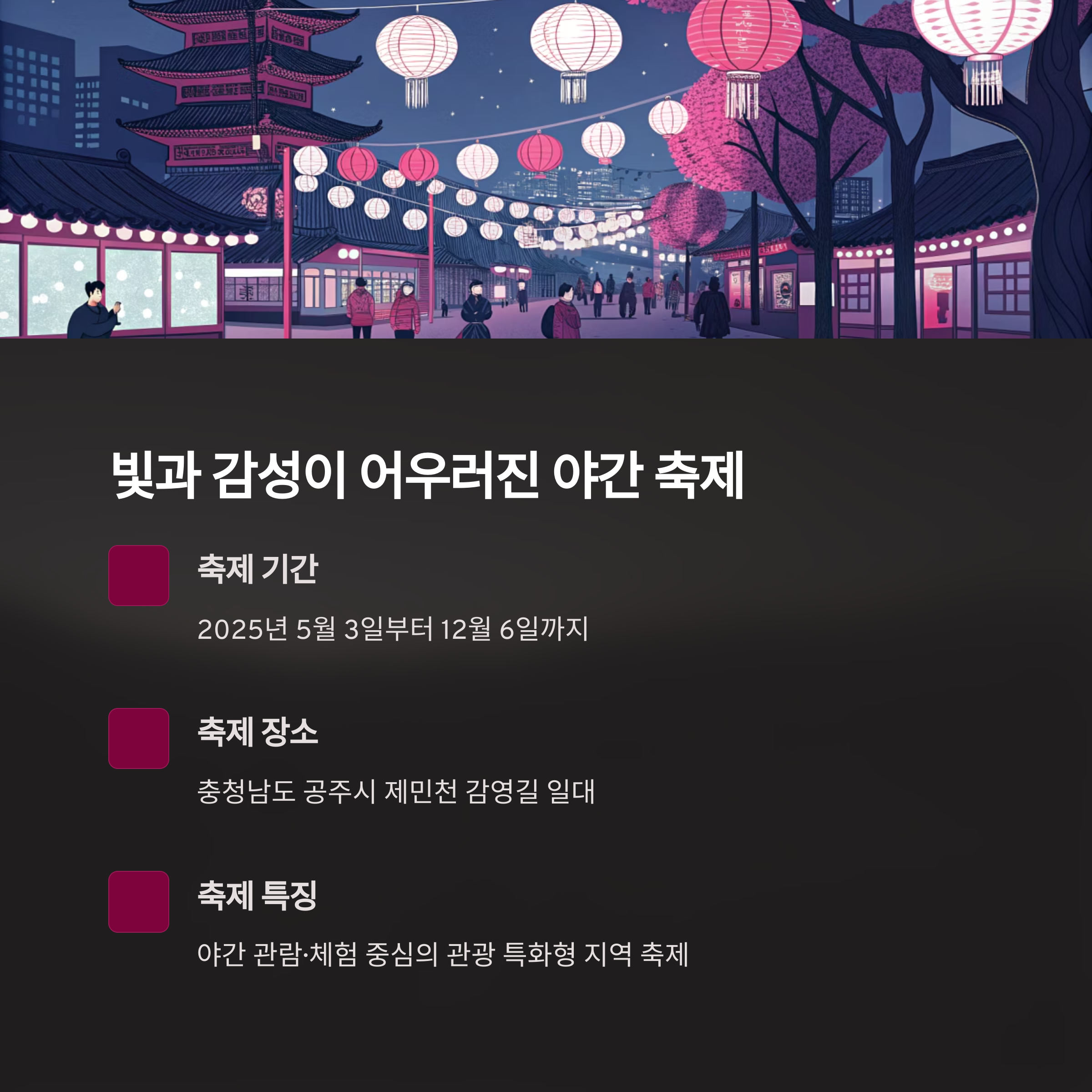 야간 관람·체험 중심의 관광 특화형 지역 축제입니다.