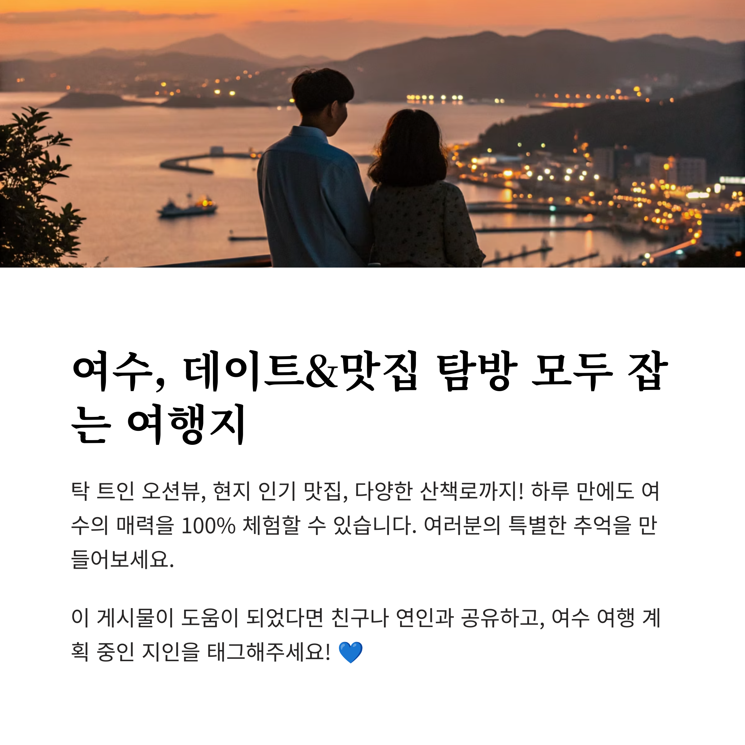 여수는 하루라는 짧은 시간이 아쉬울 정도로 볼거리와 먹거리가 풍성한 여행지입니다. 오션뷰 산책로에서 시작해 감성적인 오션뷰 카페에서 여유를 즐기고, 여수 특유의 신선한 해산물로 구성된 맛집에서 식사를 하고, 밤에는 낭만 가득한 야경과 함께 낭만포차에서 하루를 마무리하는 일정은 여행자에게 큰 만족을 선사합니다. 이번 여행이 여러분의 기억 속에 오래 남을 따뜻한 추억이 되길 바라며, 앞으로도 알찬 여행 정보를 지속적으로 공유드릴게요.