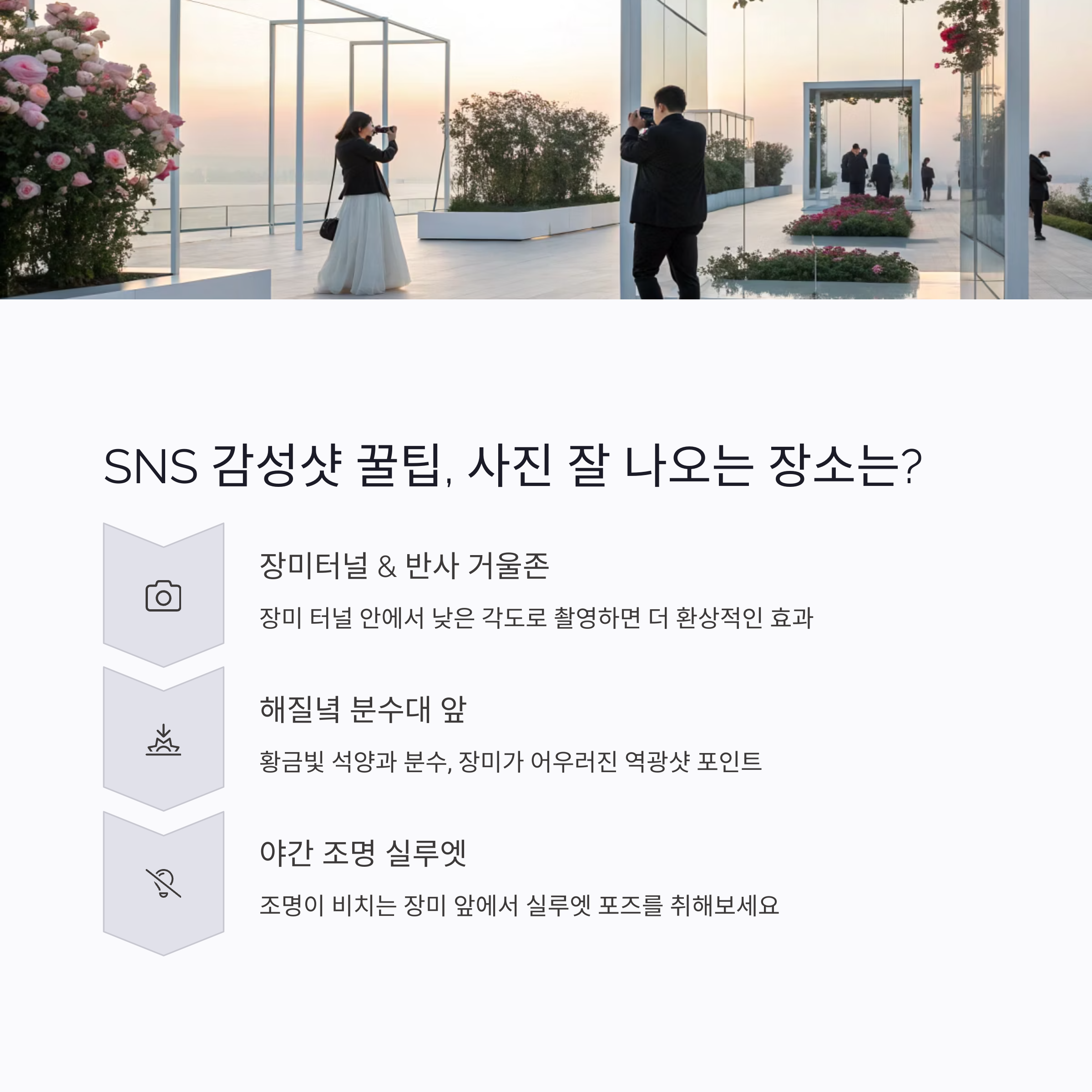 장미터널을 포함한 포토존은 오후에 붐비는 경우가 많으니 이른 시간 방문을 추천드려요