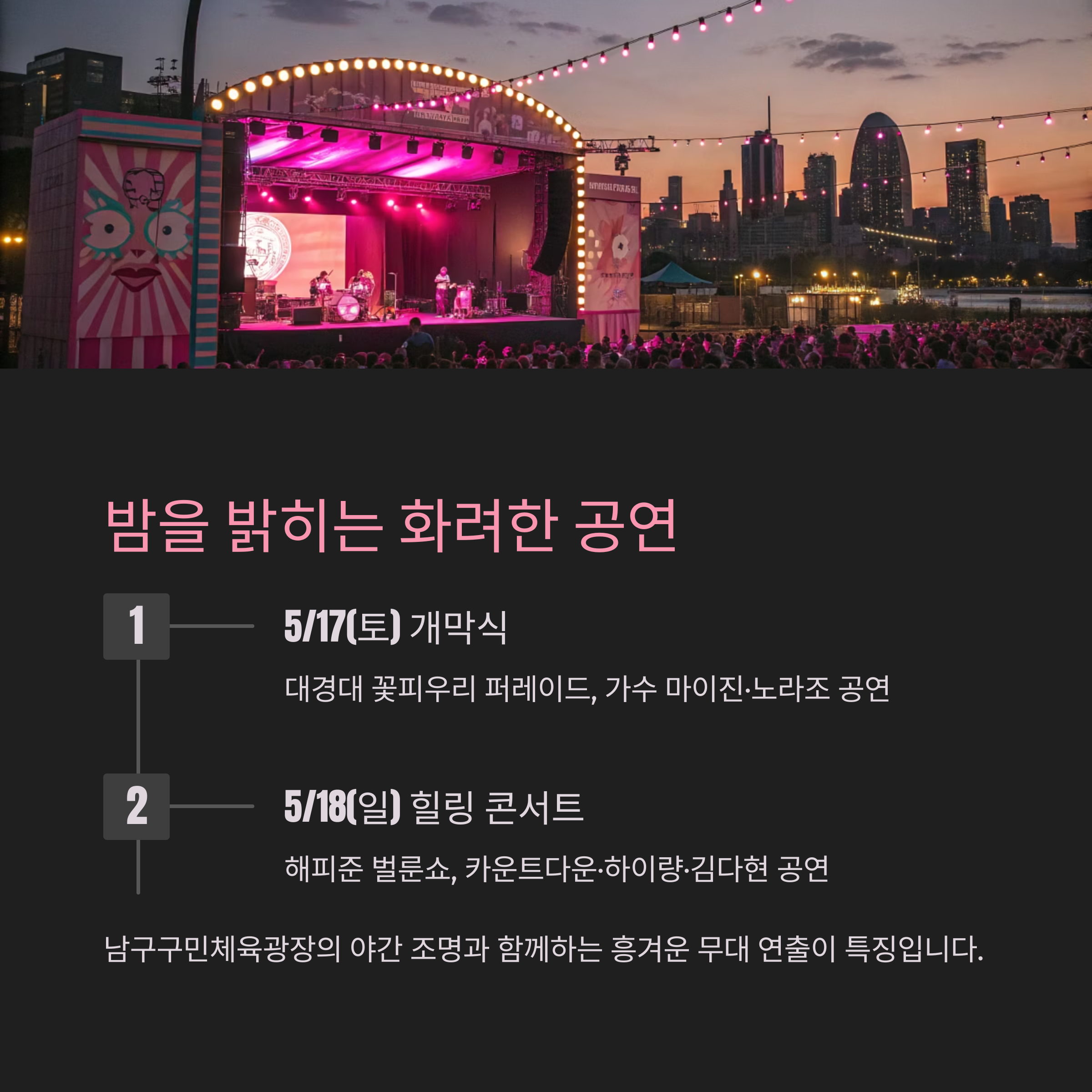 야간 조명과 함께하는 흥겨운 분위기의 무대 연출이 특징입니다.
