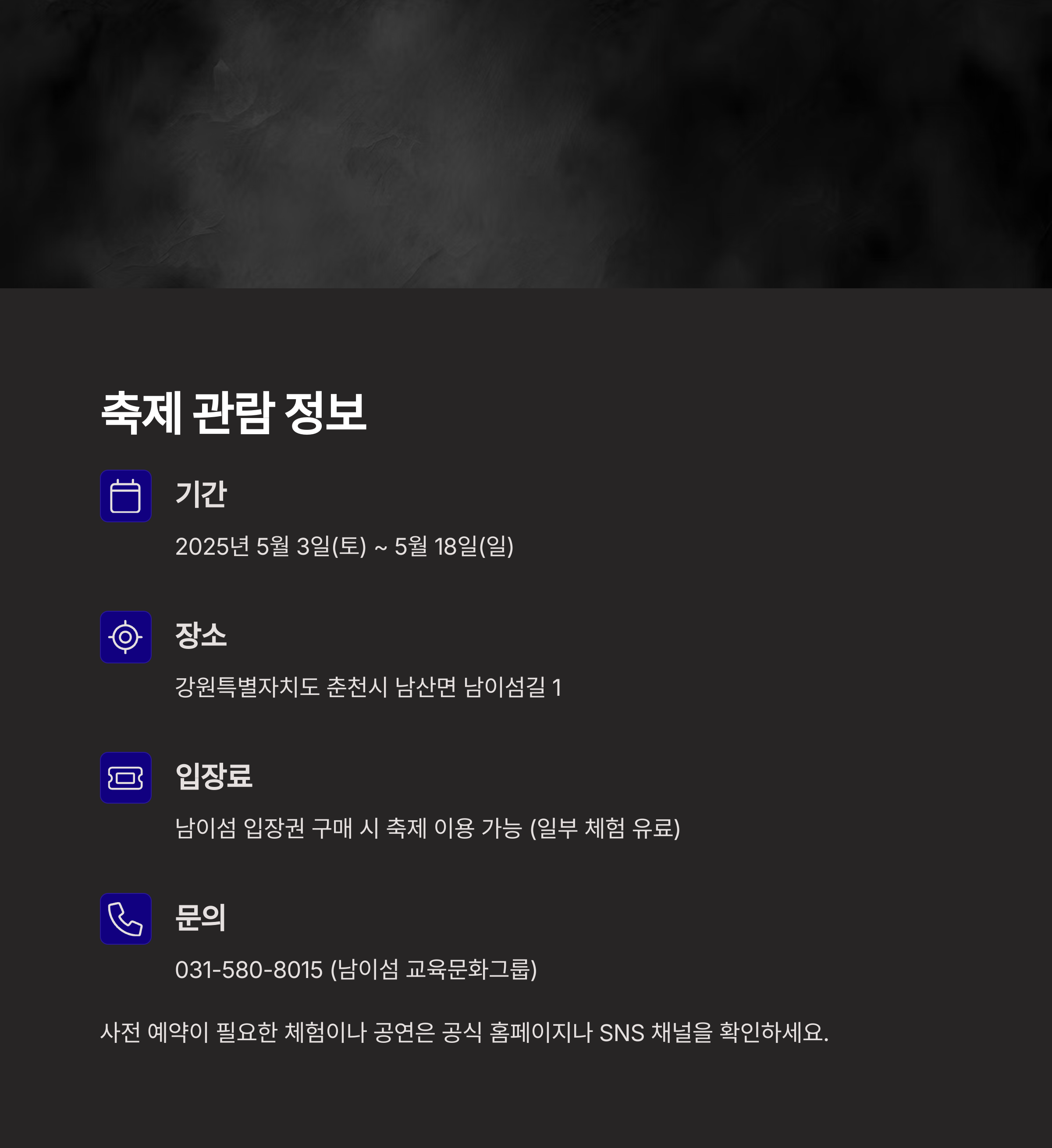 | 문의 | 031-580-8015 (남이섬 교육문화그룹) |