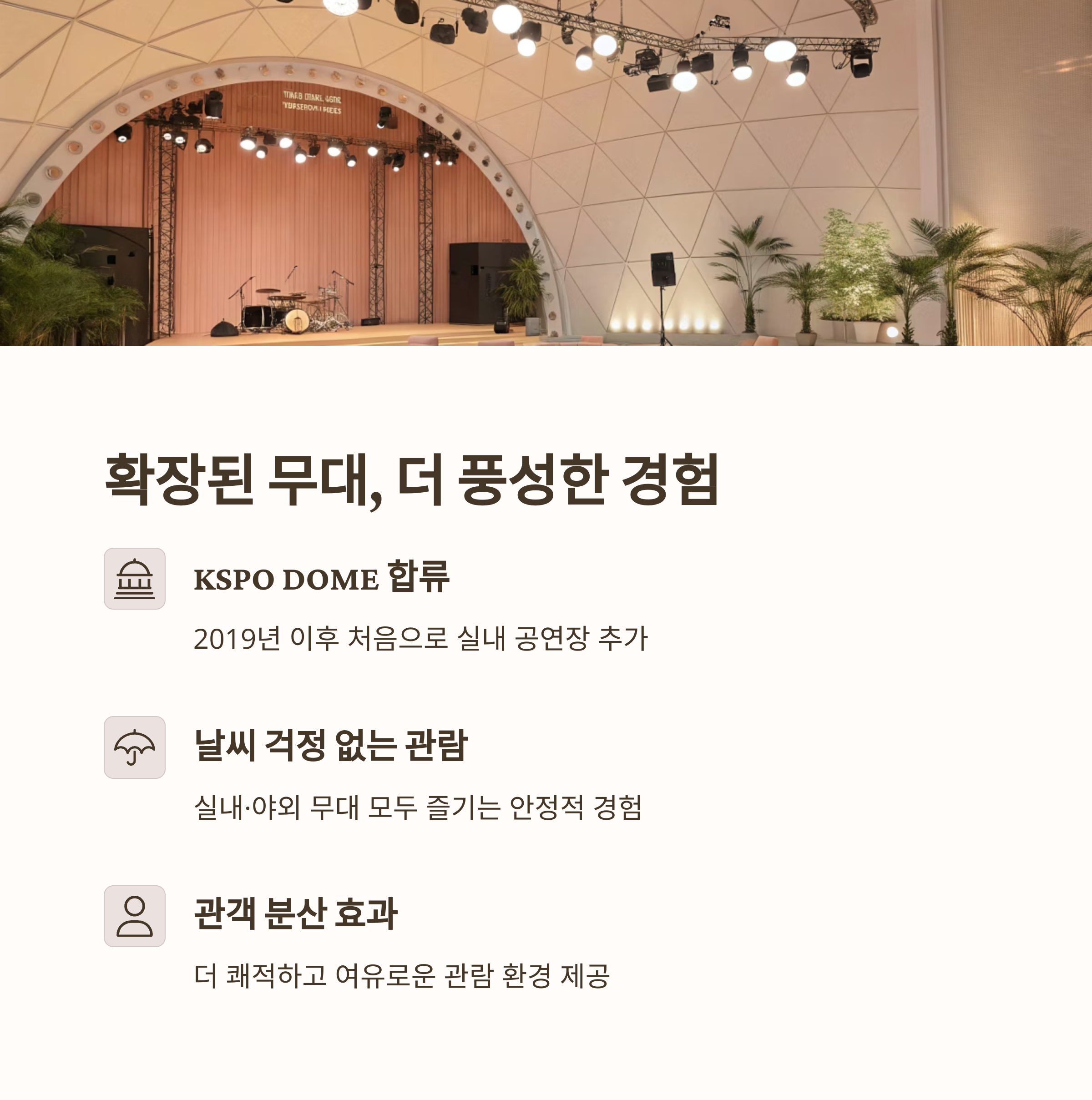 날씨 걱정 없는 관람, 관객 분산 효과, 다양한 스테이지 감상이 모두 가능해