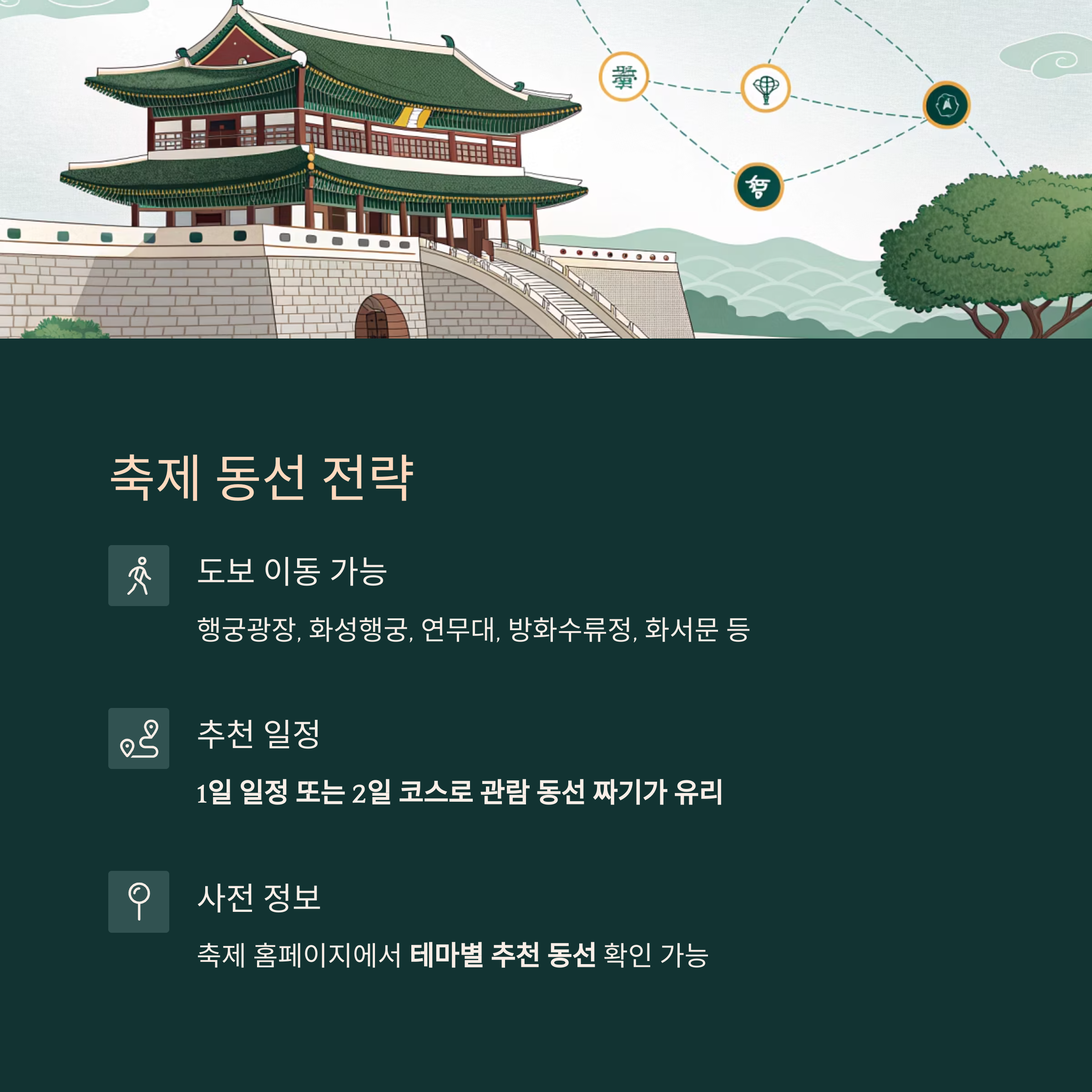 | 정조대왕 능행차 | 1,000명 규모 행렬 퍼레이드 | 수원 주요도로 |