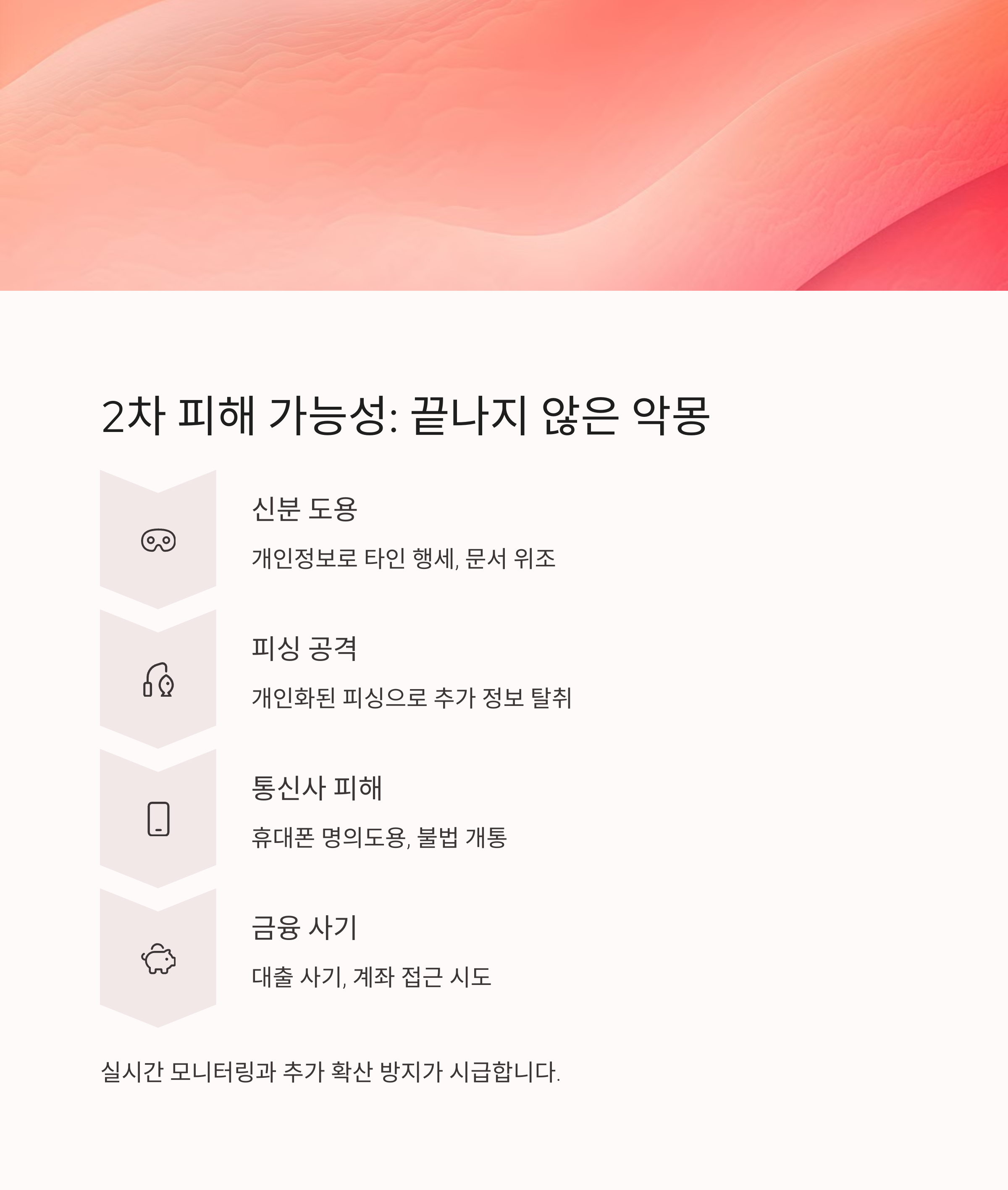 개인정보가 노출되면서 향후 금융 피해, 명의 도용, 보이스피싱 등 다양한 2차 피해가 예상됩니다